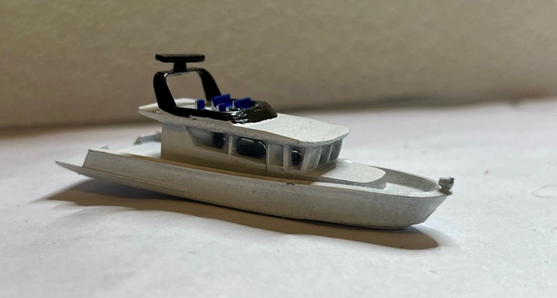 Das Modell ist mit einem SLA-Drucker erstellt und man kann die Druckmuster erkennen. Sie können das Motorboot farblich frei gestalten, Acrylfarbe oder Aqua color eignet sich besonders gut.